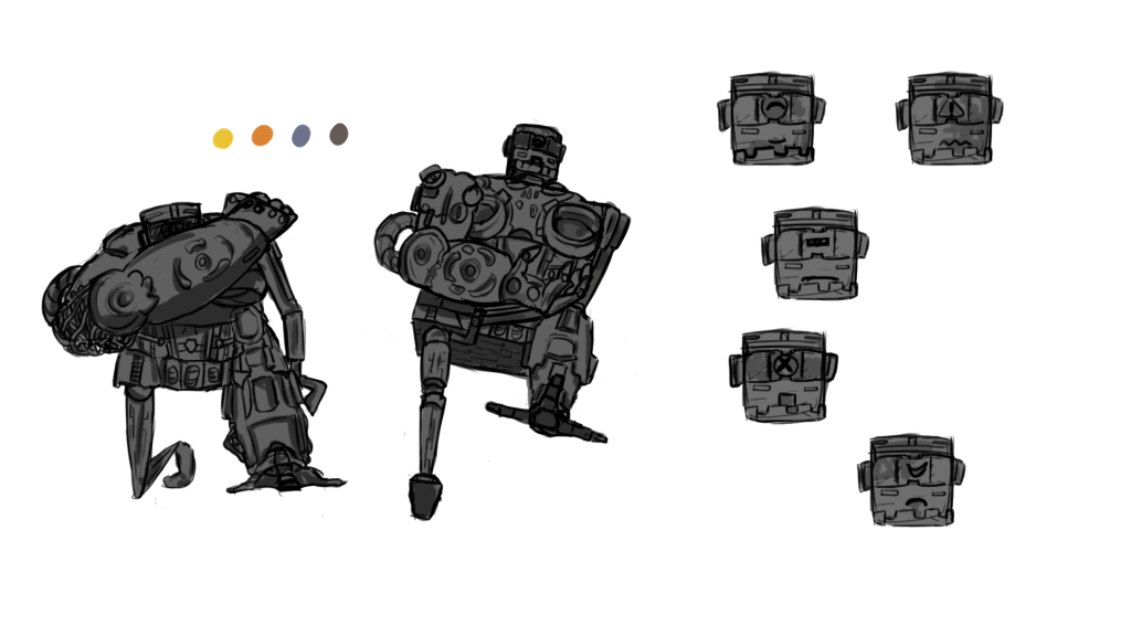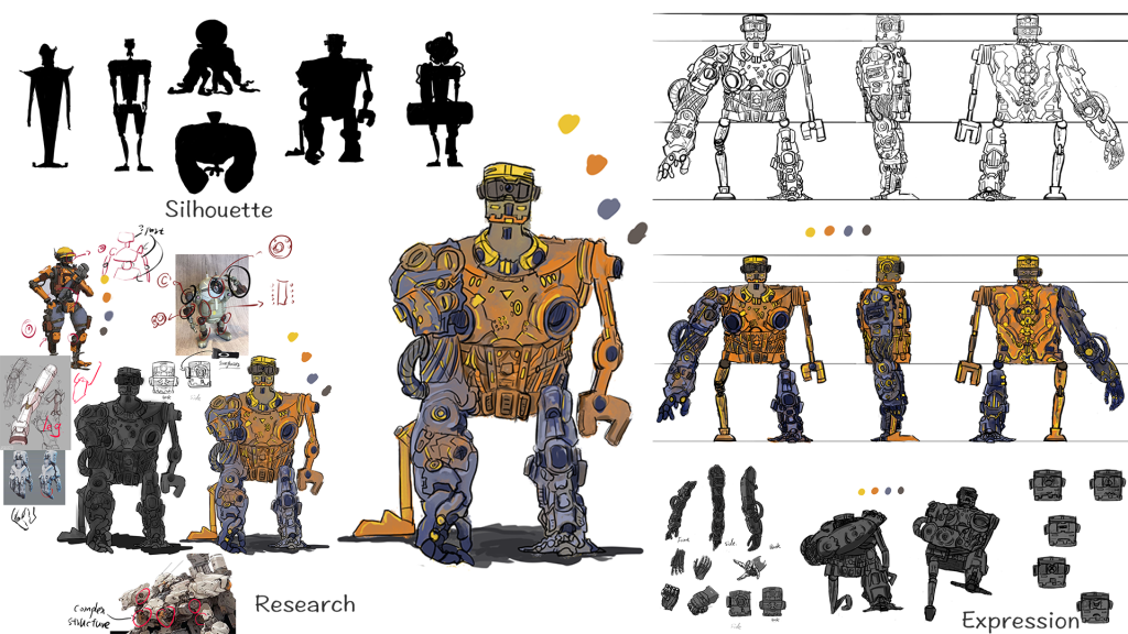 My character is a robot. For the character aspect of the design, I wanted to display complex structure to the audience, so in terms of research, I researched robotic arms and robot body structure. In the colour aspect, I referenced the colours of work clothes as the character is a service type.